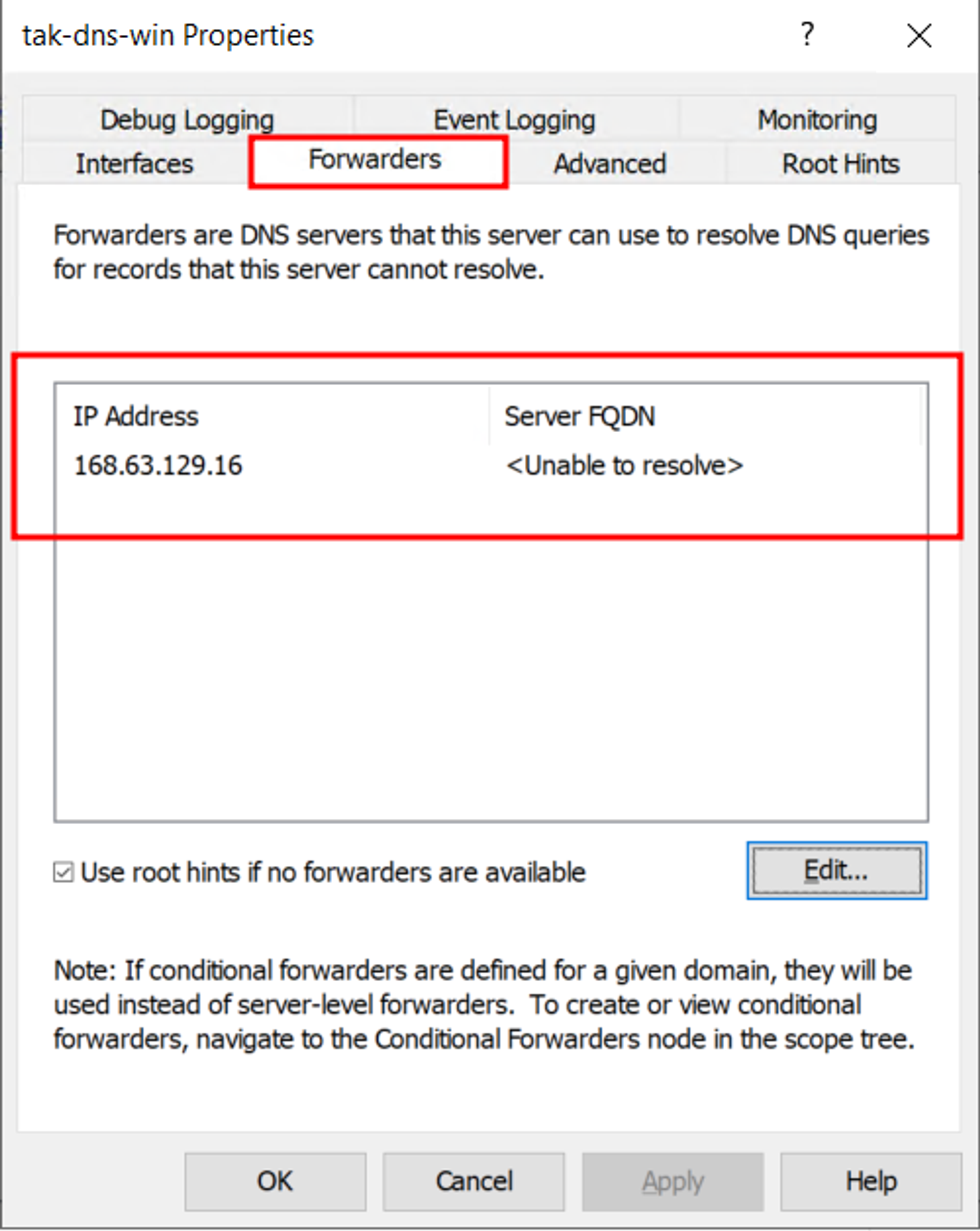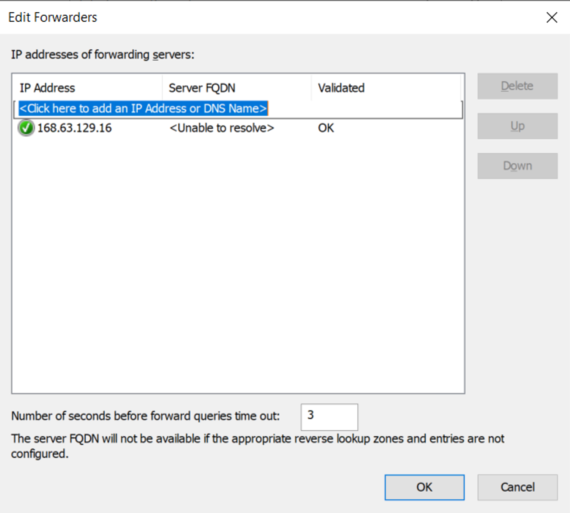 - 해당 DNS 서버의 Forwarders에서 Azure DNS 가상 서버 IP(168.63.129.16) 를 바라보게 되는 구성