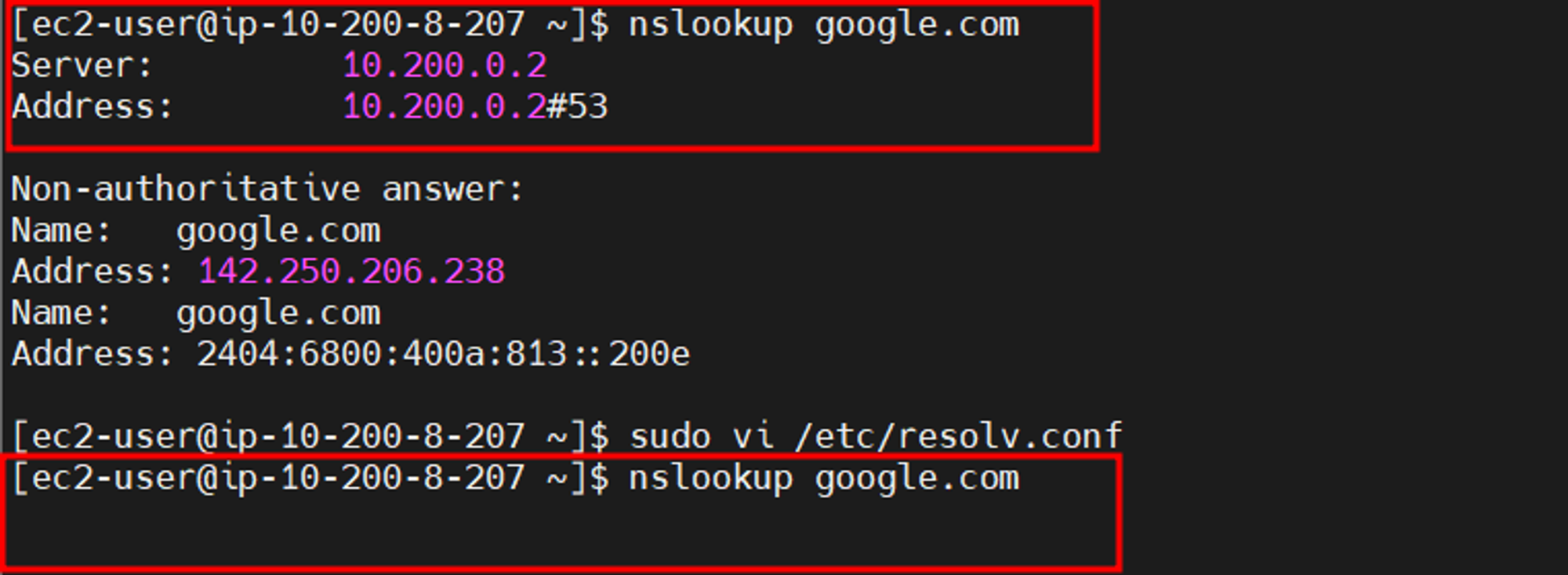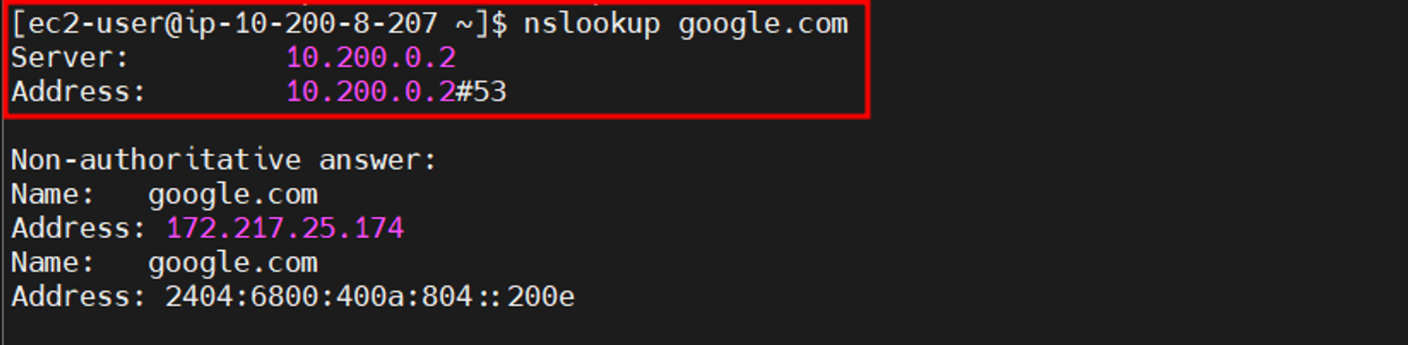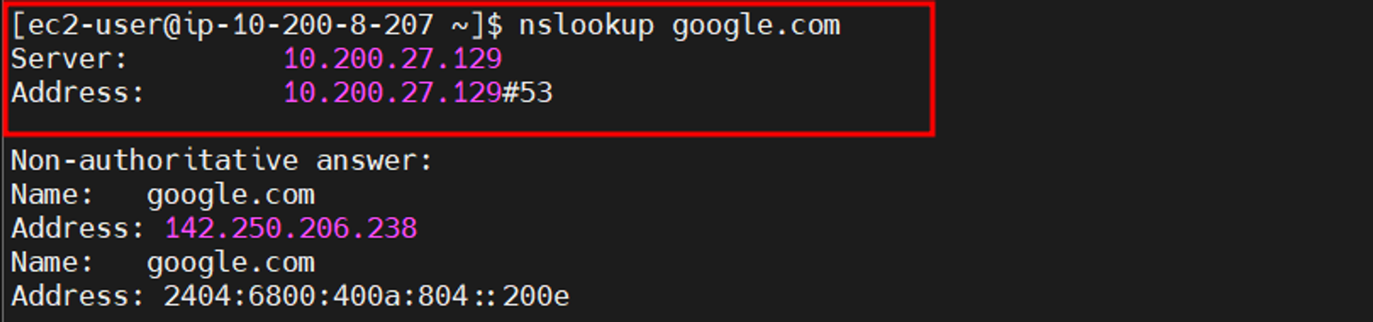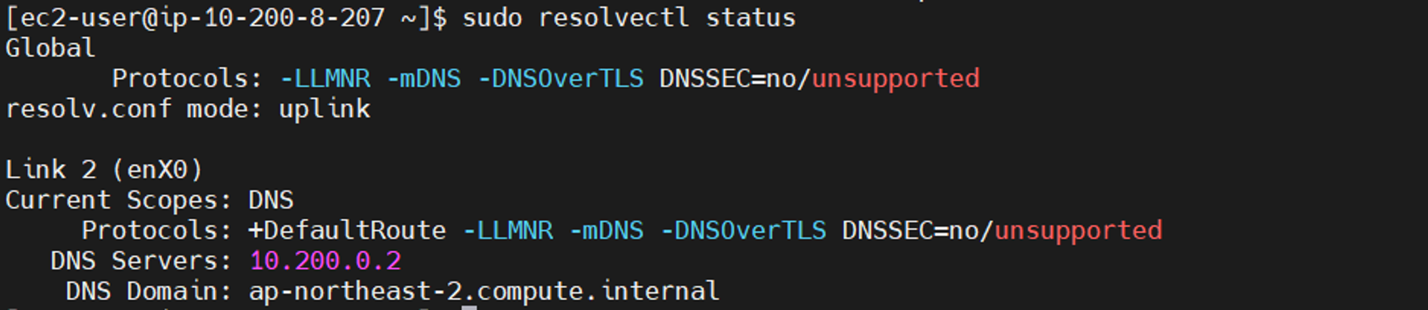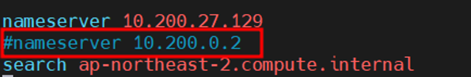 - 만약 별도의 구성 없이 *기본값(기본 DNS 정보이며, AWS에서 구성한 VPC의 대역(10.200.0.0/16) 내 포함되어 있는 내부 IP)으로 진행한다면, 아래와 같이 클라이언트 단에서 변경한 DNS의 정보값이 반영되지 않습니다.