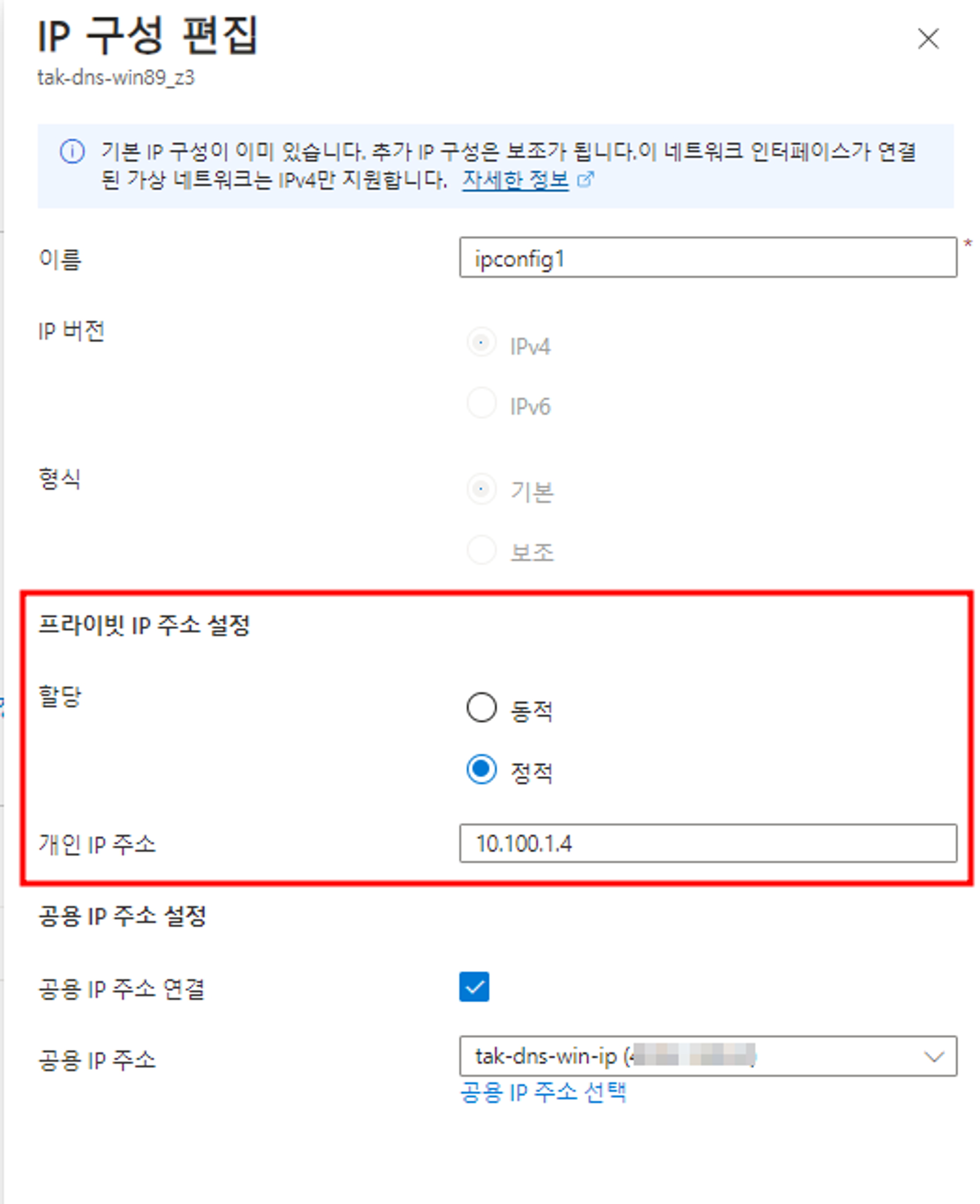 - Azure DNS Server의 Private IP 입력