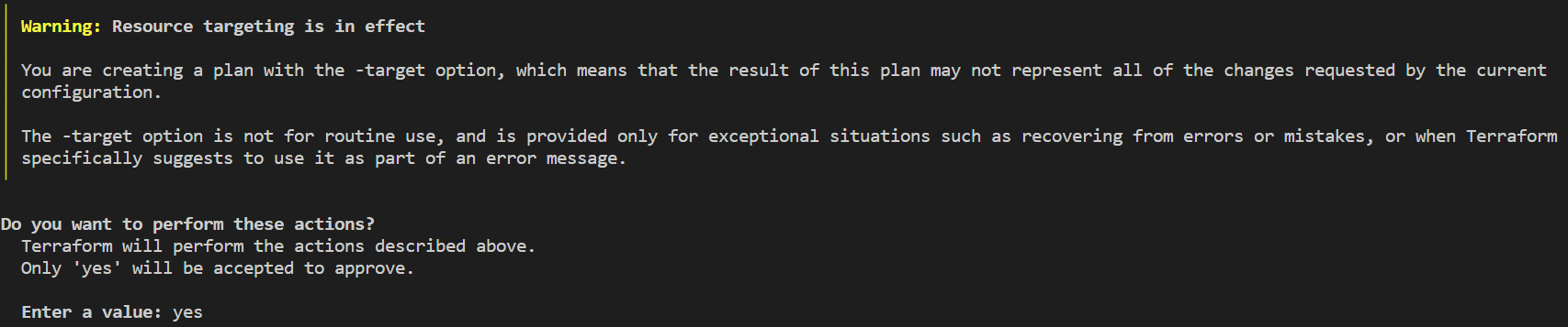 You are creating a plan with the -target option, which means that the result of this plan may not represent all of the changes requested by the current configuration.The -target option is not for routine use, and is provided only for exceptional situations such as recovering from errors or mistakes, or when Terraform specifically suggests to use it as part of an error message.