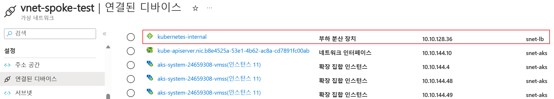 - Azure Portal 상에서 Load Balancer가 존재하는 VNet을 선택하면 [설정] 블레이드의 [연결된 디바이스] 탭에서 kubernetes-internal이라는 이름의 Load Balancer가 snet-lb라는 subnet 대역에 배포되어 있는 것을 확인할 수 있습니다.
