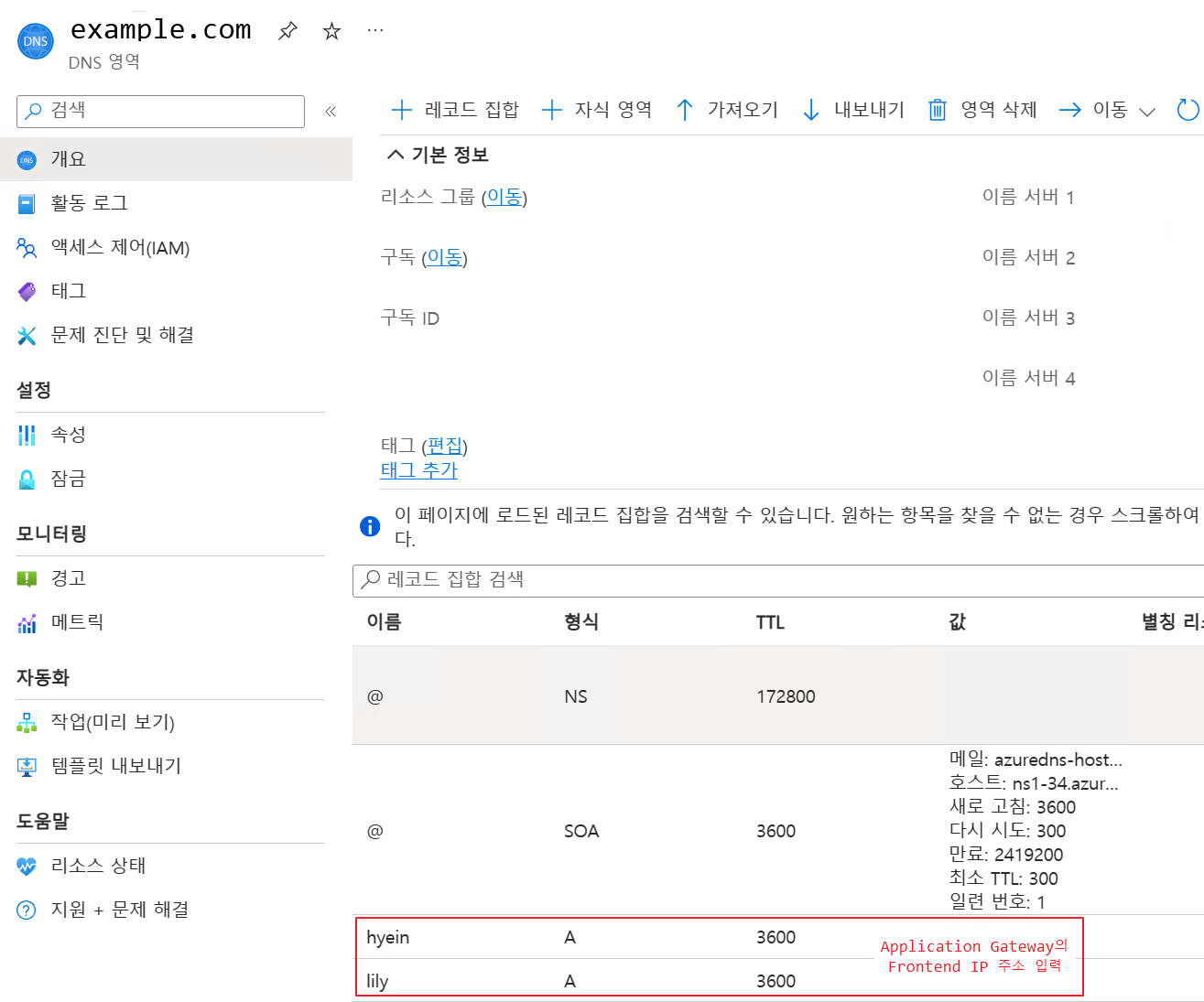 - 또한 Azure Application Gateway의 Frontend IP 주소를 각 레코드와 매핑해 주어야 합니다.