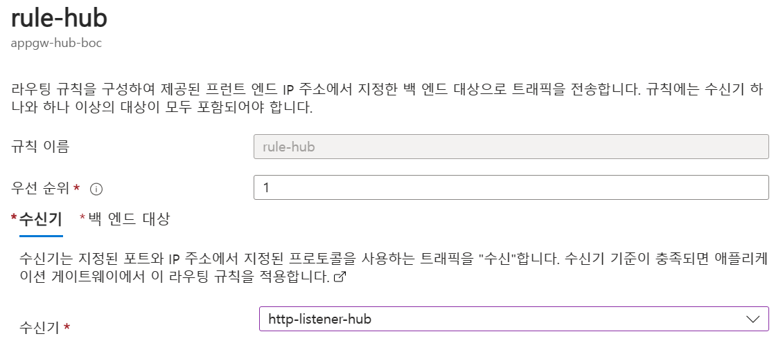 - Azure Application Gateway는 Frontend IP 주소로 traffic이 들어오면 Azure Application Gateway 내 구성된 규칙을 확인하여 지정된 백 엔드 대상으로 트래픽을 전송합니다.