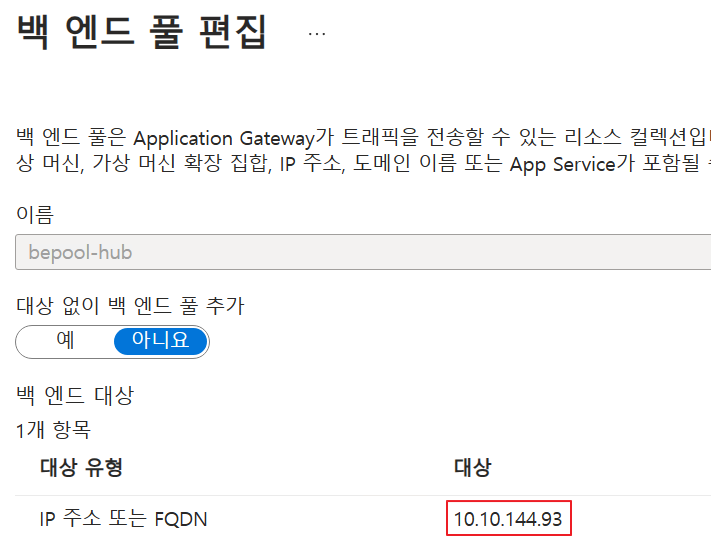 - Azure Application Gateway의 백 엔드 풀 대상으로 Ingress의 Address를 입력해 줍니다.
