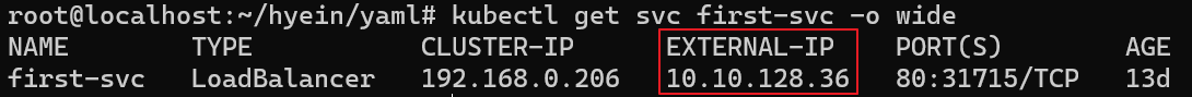 - 실제로 생성을 한 후에 kubectl get svc first-svc -o wide 명령어를 입력하여 확인해 보면 하기와 같이 External IP가 Private IP인 것을 확인할 수 있습니다.