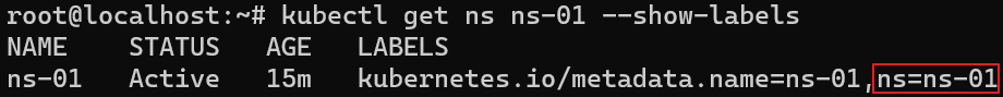- ns-01 namespace에 ns: ns-01이라는 Label이 붙어 있는 것을 다시 확인합니다.