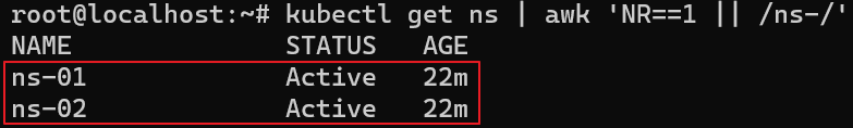 - kubectl get ns | awk ‘NR==1 || /ns-/' ← 이 명령어는 첫 번째 행 또는 ns-라는 문자열이 포함된 행을 출력하라는 의미입니다.