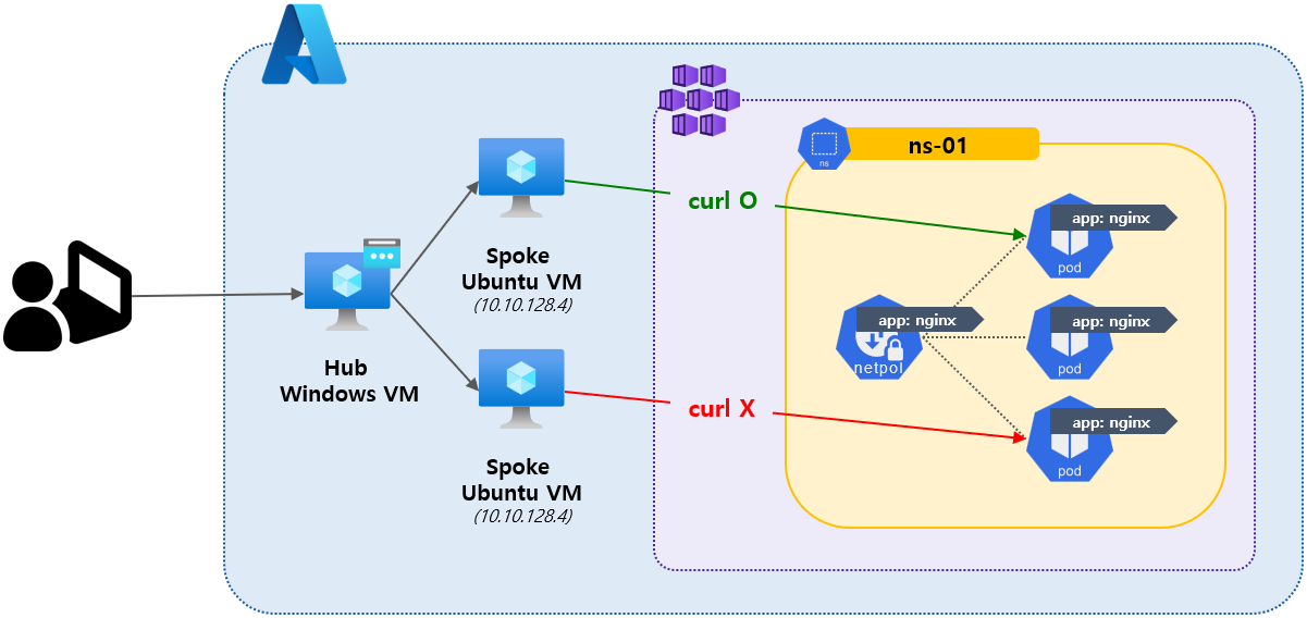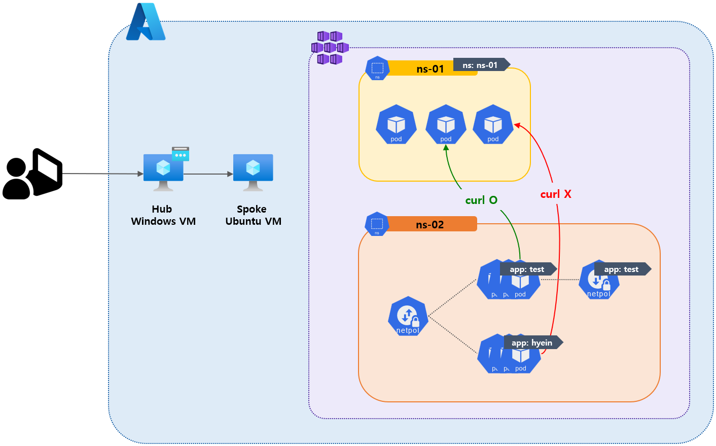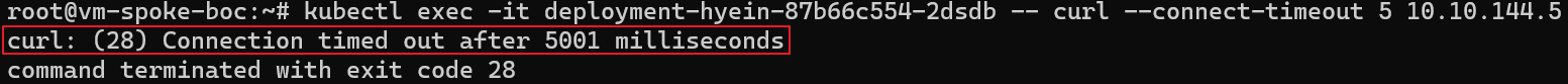 - Network Policy를 적용한 후에는 aks와 같은 VNet 대역에 있는 VM에서 curl 명령어를 해당 pod의 ip로 날려도 통신이 되지 않는 것을 확인할 수 있습니다.