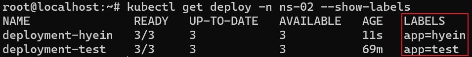 - ns-02 namespace에 있는 Deployment 및 Label를 조회하기 위한 명령어는 하기와 같습니다.