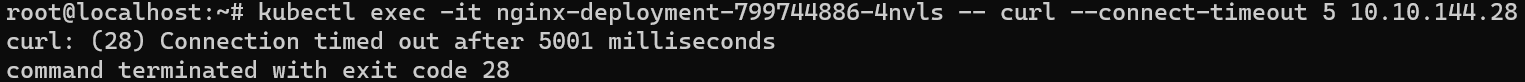 - kubectl exec -it nginx-deployment-799744886-4nvls -- curl --connect-timeout 5 10.10.144.28