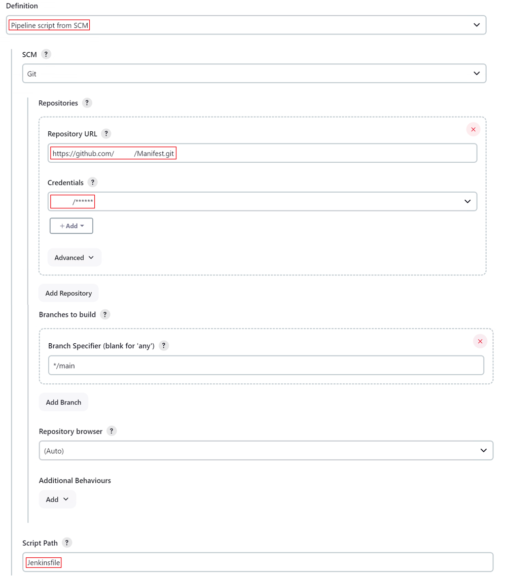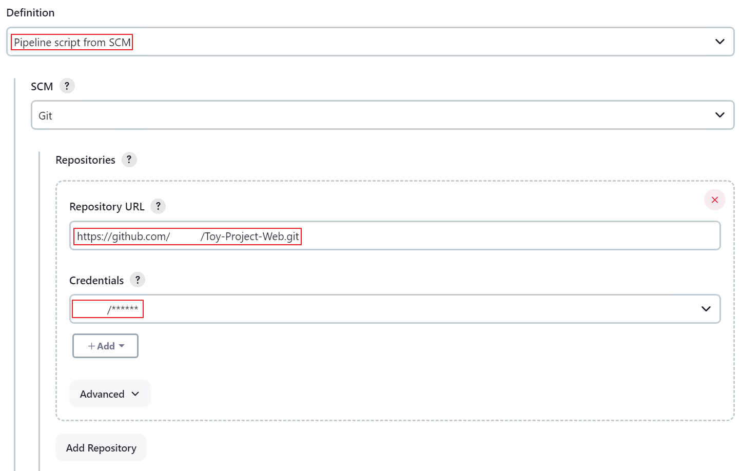 - GitHub Repository가 Private Repository일 경우 [+ Add] 버튼을 클릭하여 User name과 PAT(Personal Access Token)에 대한 값이 저장된 Credentials을 생성해야 합니다.