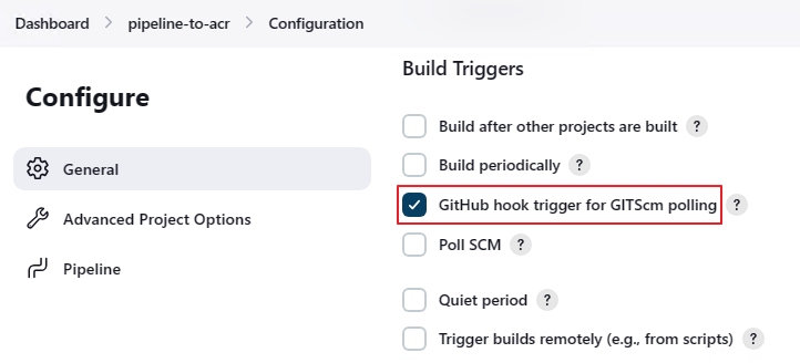 - Build Triggers 중 [GitHub hook trigger for GITScm polling] 옵션을 선택합니다.