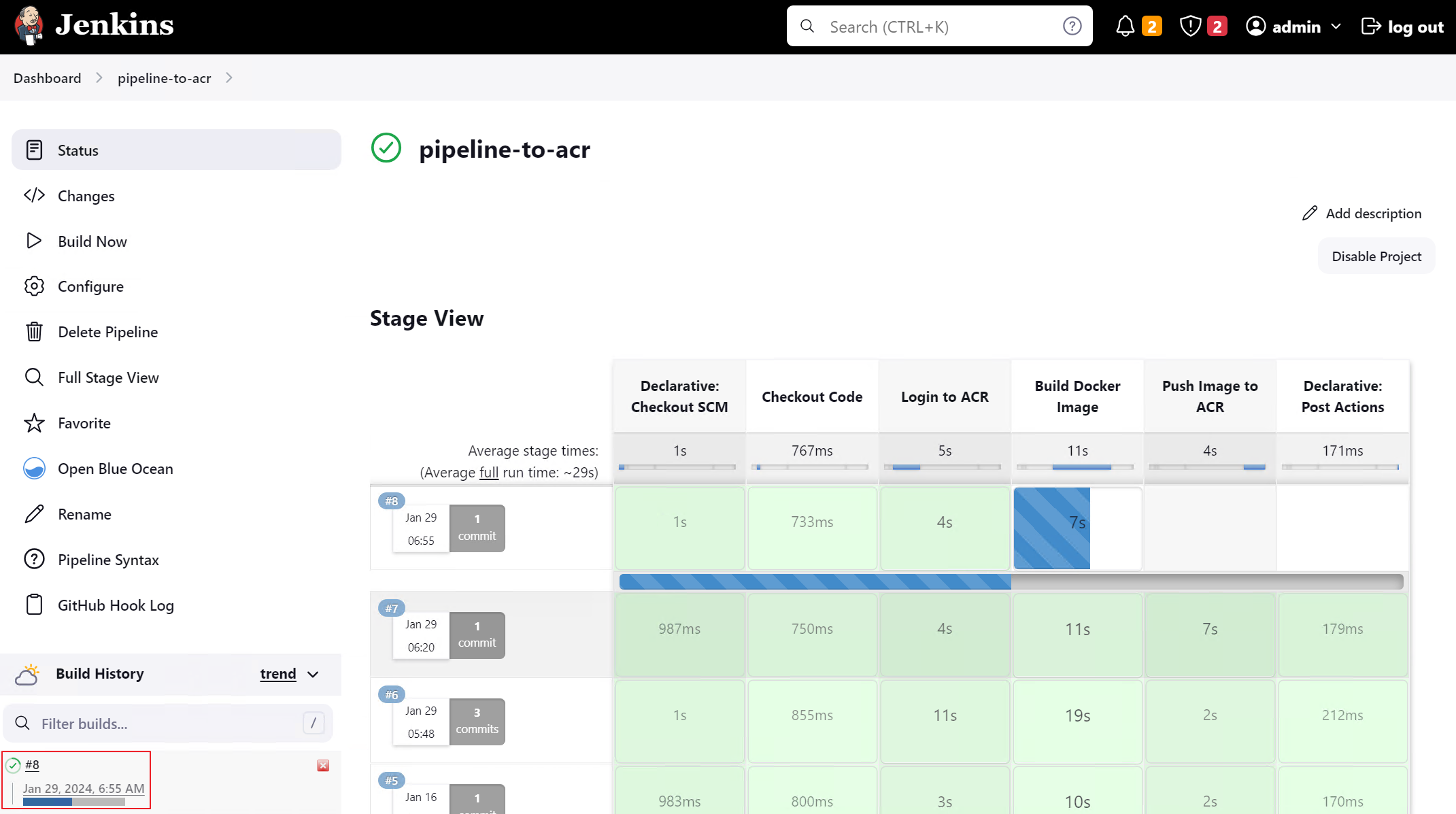 ➡️ 코드를 수정한 후 GitHub에 변경 사항을 push하면 Jenkins는 GitHub webhook에 의해 변경 사항이 발생했다는 것을 감지합니다. 그 후, Jenkins는 자동으로 job을 실행하여 ACR에 변경 사항이 적용된 이미지를 push합니다.