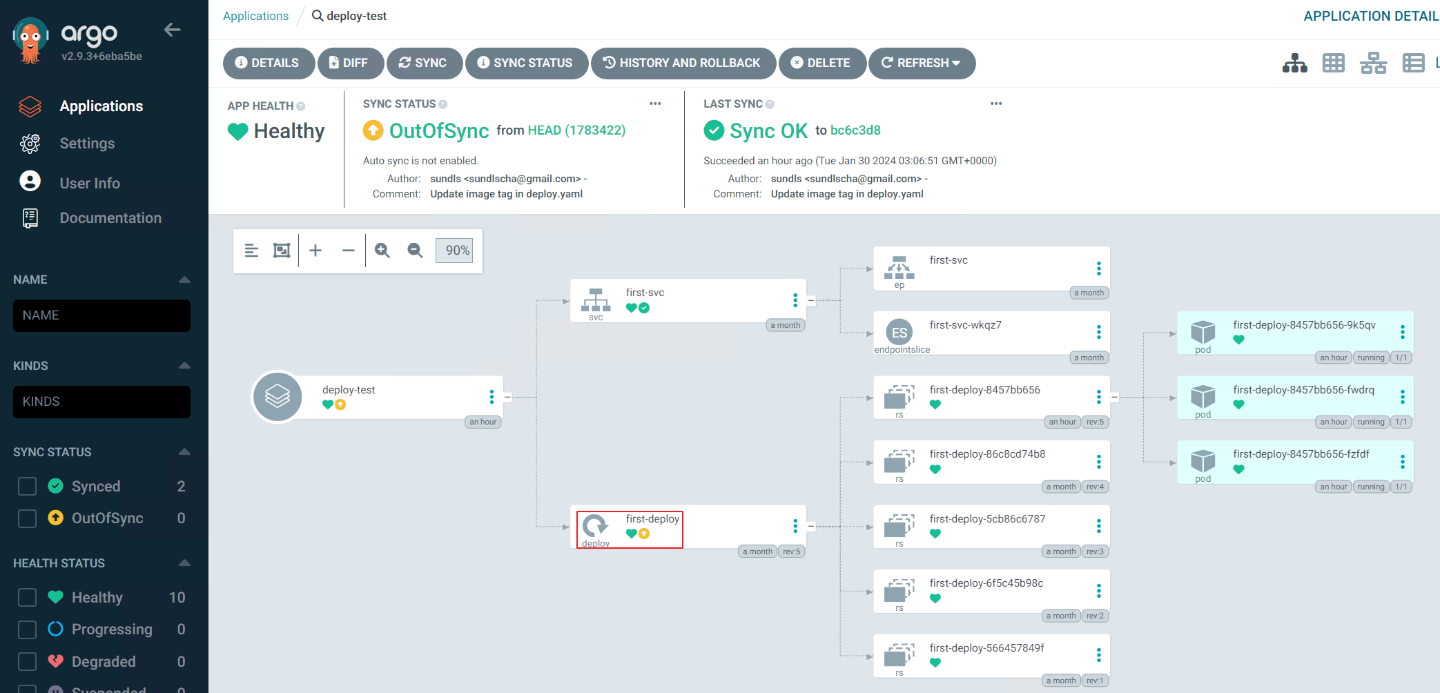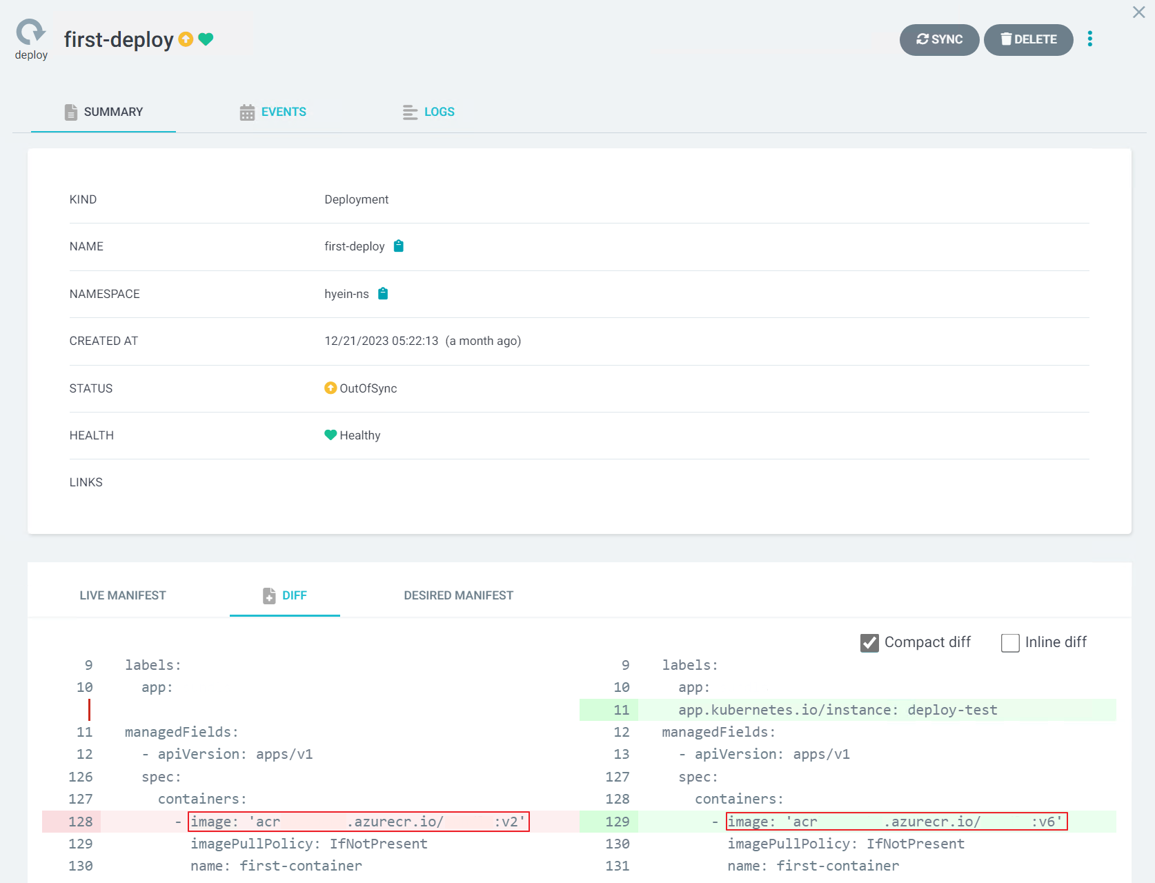 - 생성된 Application을 클릭한 후 Out of Sync가 떠 있는 Deployment를 클릭합니다.