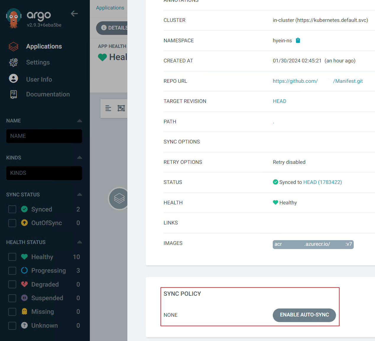 - ArgoCD 상단의 [Details] 버튼을 클릭한 후 하단의 [Sync Policy] 탭에서 [Enable Auto-Sync]를 클릭합니다.