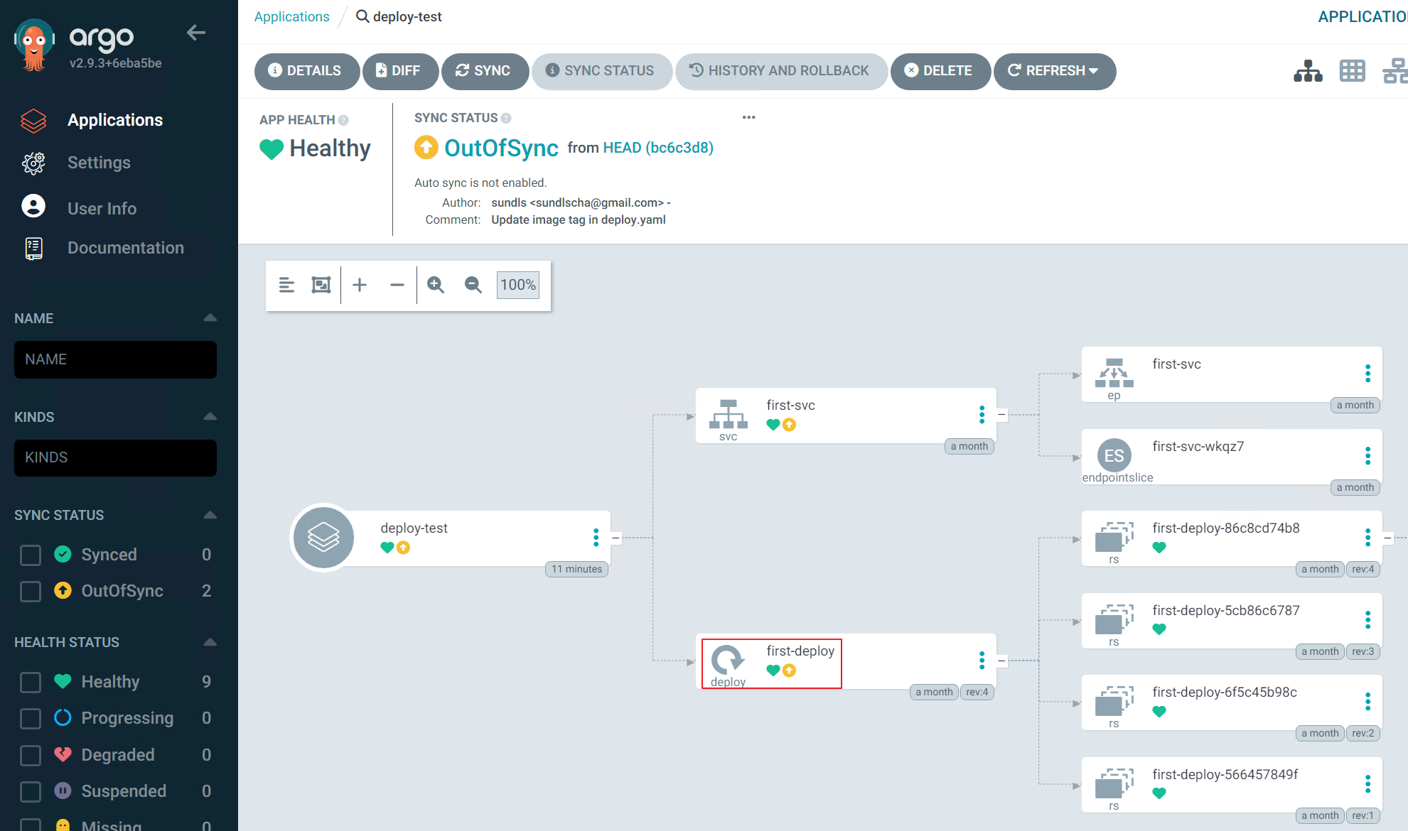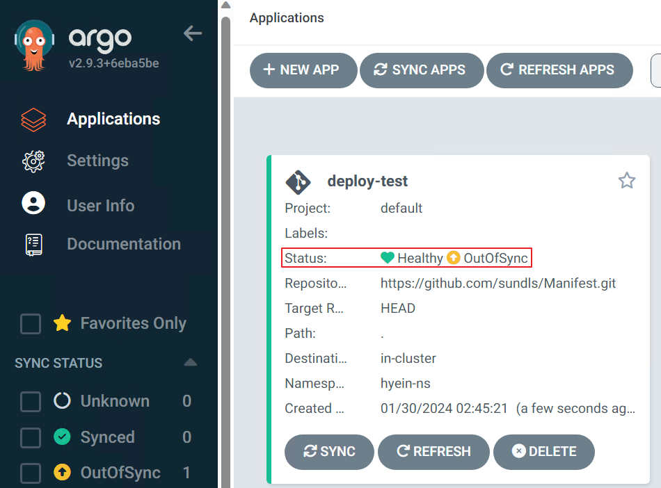 - Status 부분을 보면 해당 Application의 상태가 OutOfSync 임을 알 수 있습니다.