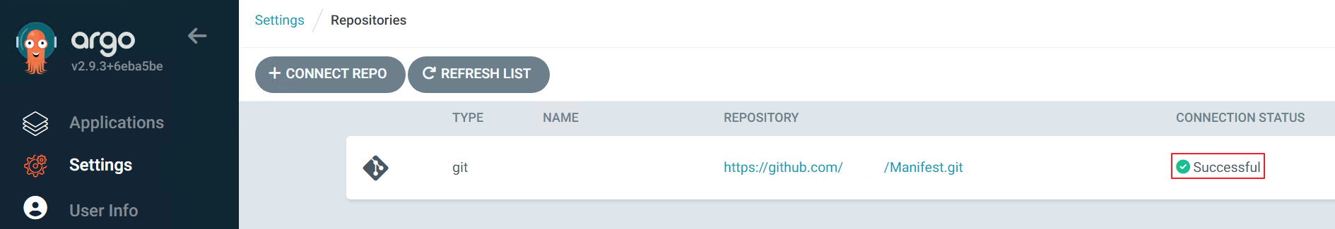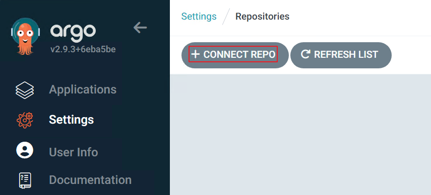 - ArgoCD 로그인 > 좌측 상단의 [Settings] 탭 > [Repositories]