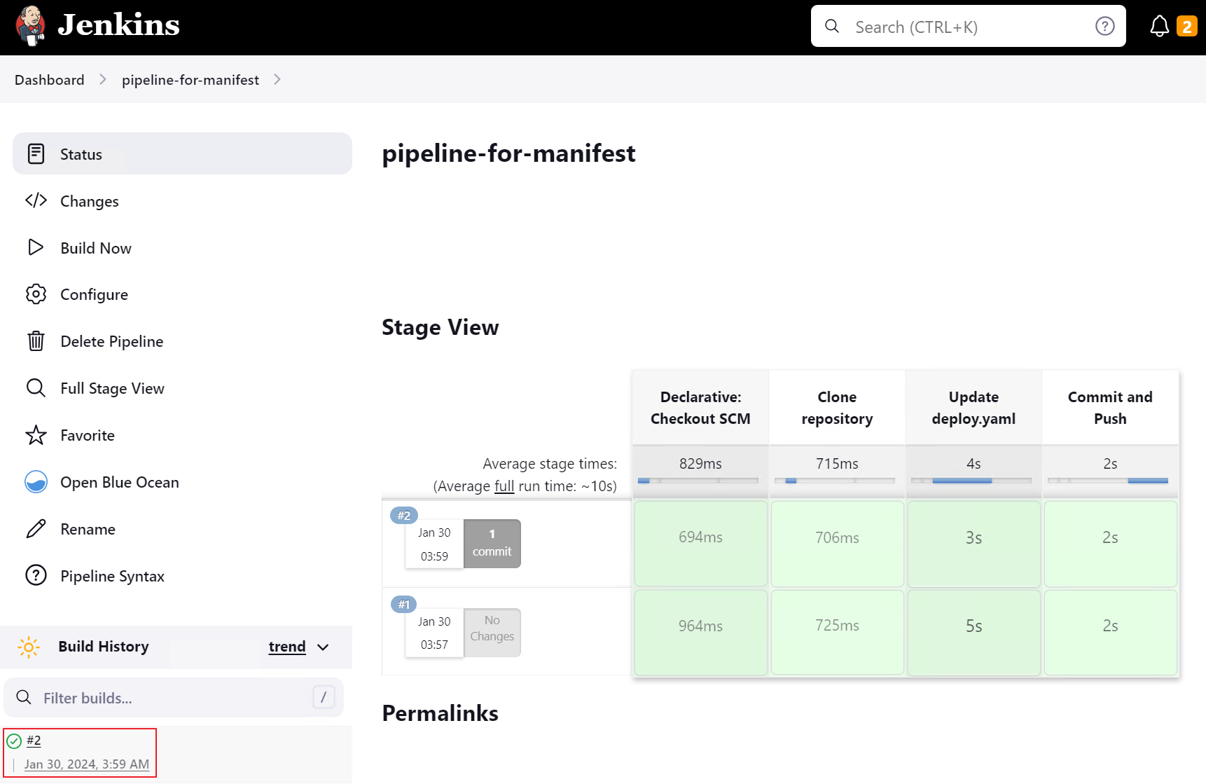 - 두 번째 Jenkins Project를 클릭하면 별도의 사용자 개입 없이 두 번째 Job이 자동으로 trigger 되는 것을 확인할 수 있습니다.