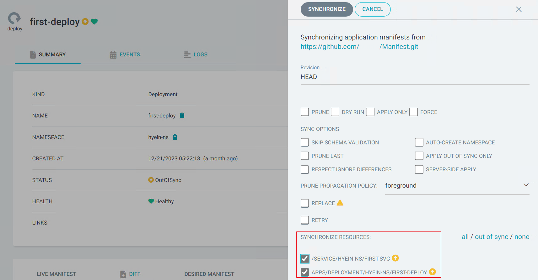 - Out of Sync 상태인 모든 Object에 대해 Synchronize를 수행합니다.