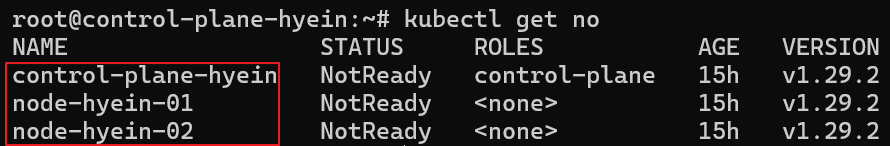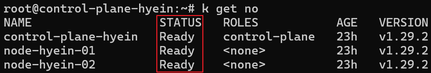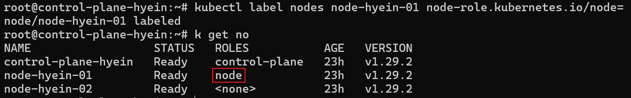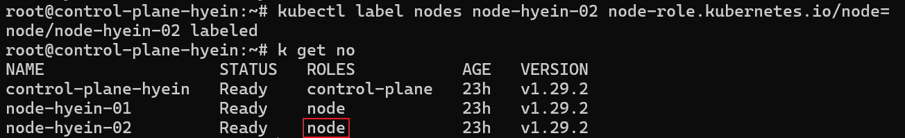 - node-hyein-01 Node의 ROLES column에 node라는 역할이 제대로 부여된 것을 확인할 수 있습니다.