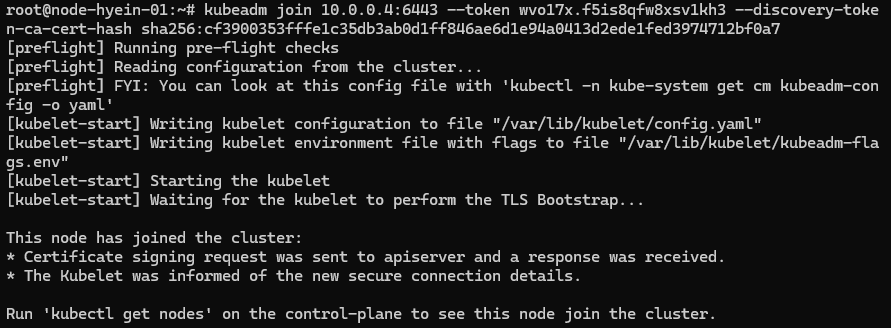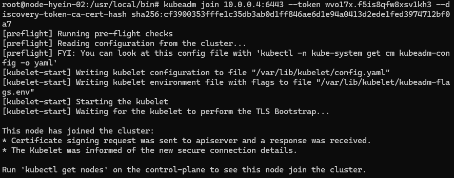 - 두 번째로 kubeadm join으로 시작하는 명령어를 Nodes에서 각각 실행합니다. (root 계정으로 실행해야 합니다.)