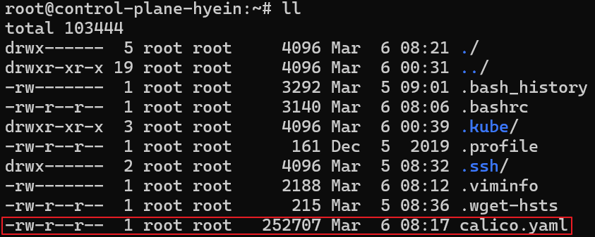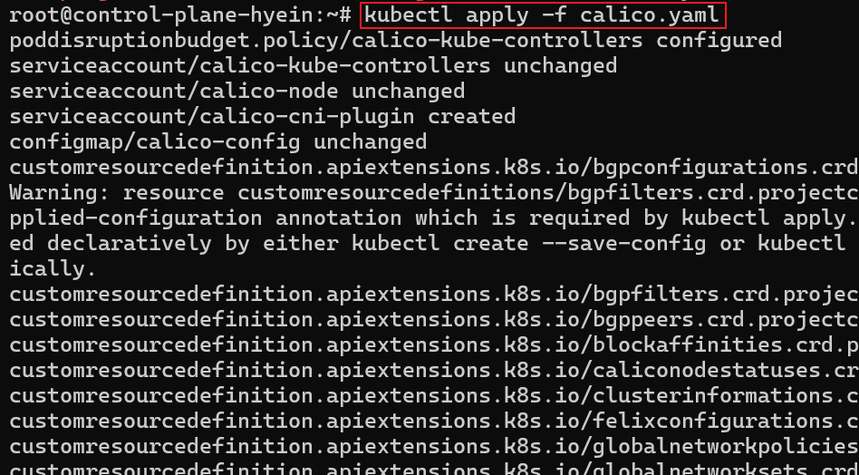 - manifest를 적용하기 위해 kubectl apply -f calico.yaml 명령어를 입력합니다.
