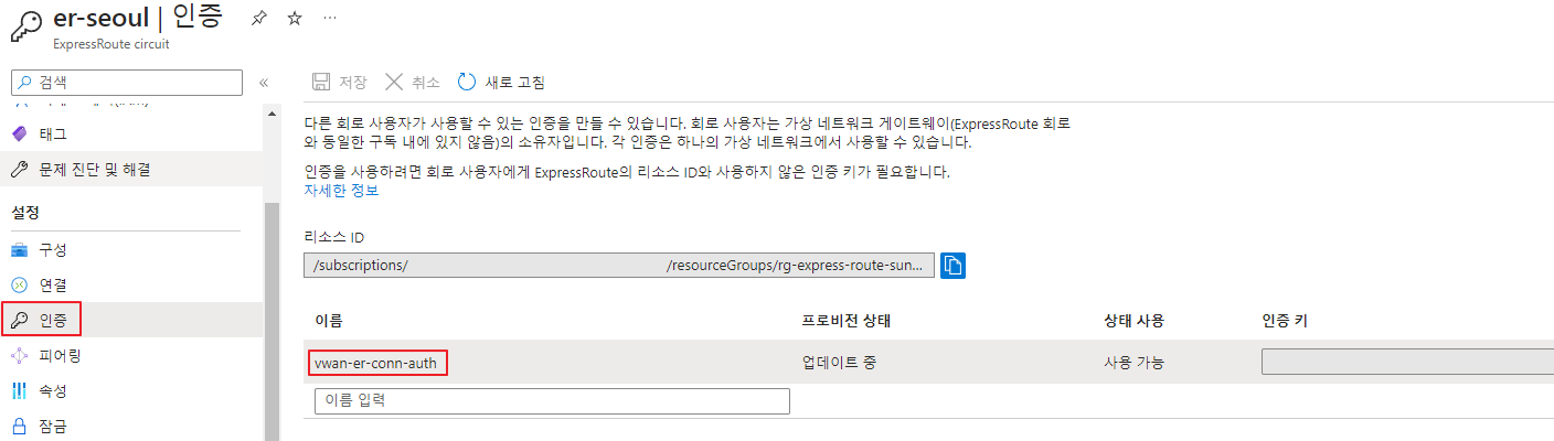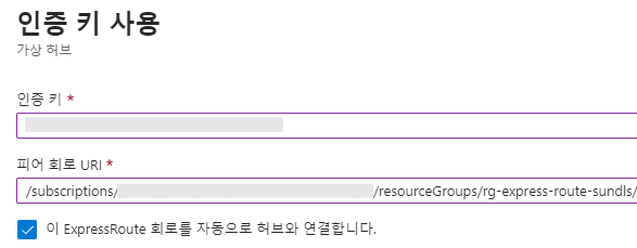 - [ExpressRoute Circuit]과 가상 허브를 연결하기 위해서는 [리소스 ID]와 [인증 키]가 필요합니다.