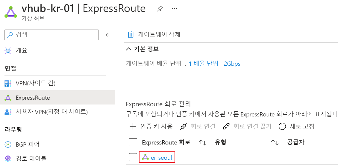 - 작업이 완료되면 위와 같이 er-seoul이라는 이름의 [ExpressRoute Circuit]이 가상 허브와 연결이 된 것을 확인할 수 있습니다.
