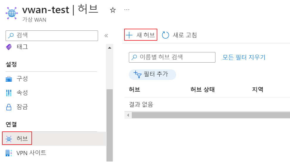 - 생성한 [Virtual WAN]을 클릭한 후 [연결] 블레이드의 [허브]를 선택합니다. 상단의 [+ 새 허브]를 클릭하여 허브를 생성합니다.