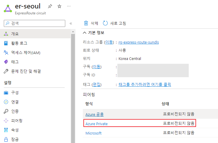 - [ExpressRoute Circuits]의 [개요] 탭에서 [피어링] 부분의 [Azure Private]을 선택합니다.