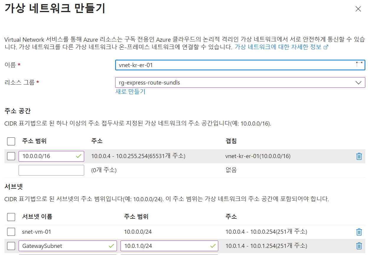 가상 네트워크 : vnet-kr-er-01 # [가상 네트워크 만들기]를 선택하여 새 [가상 네트워크] 생성 필요