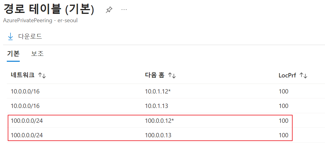 4. [ExpressRoute Circuit]의 경로 테이블을 통한 가상 허브와의 연결 확인