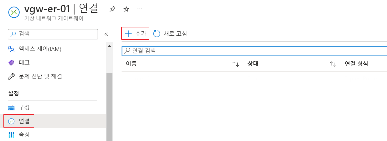 - 생성된 [가상 네트워크 게이트웨이]의 [설정] 블레이드의 [연결] 탭을 클릭한 후 [+ 추가] 버튼을 클릭하여 [연결]을 생성합니다.