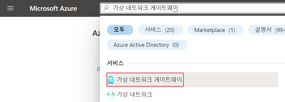 - 상단의 검색창에서 [가상 네트워크 게이트웨이]를 검색합니다.