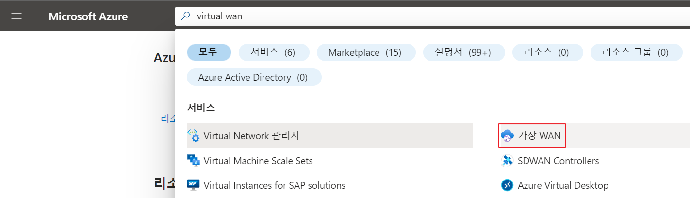 - Azure Portal (https://portal.azure.com/)에 접속하여 상단의 검색창에서 [Virtual WAN]을 검색합니다.