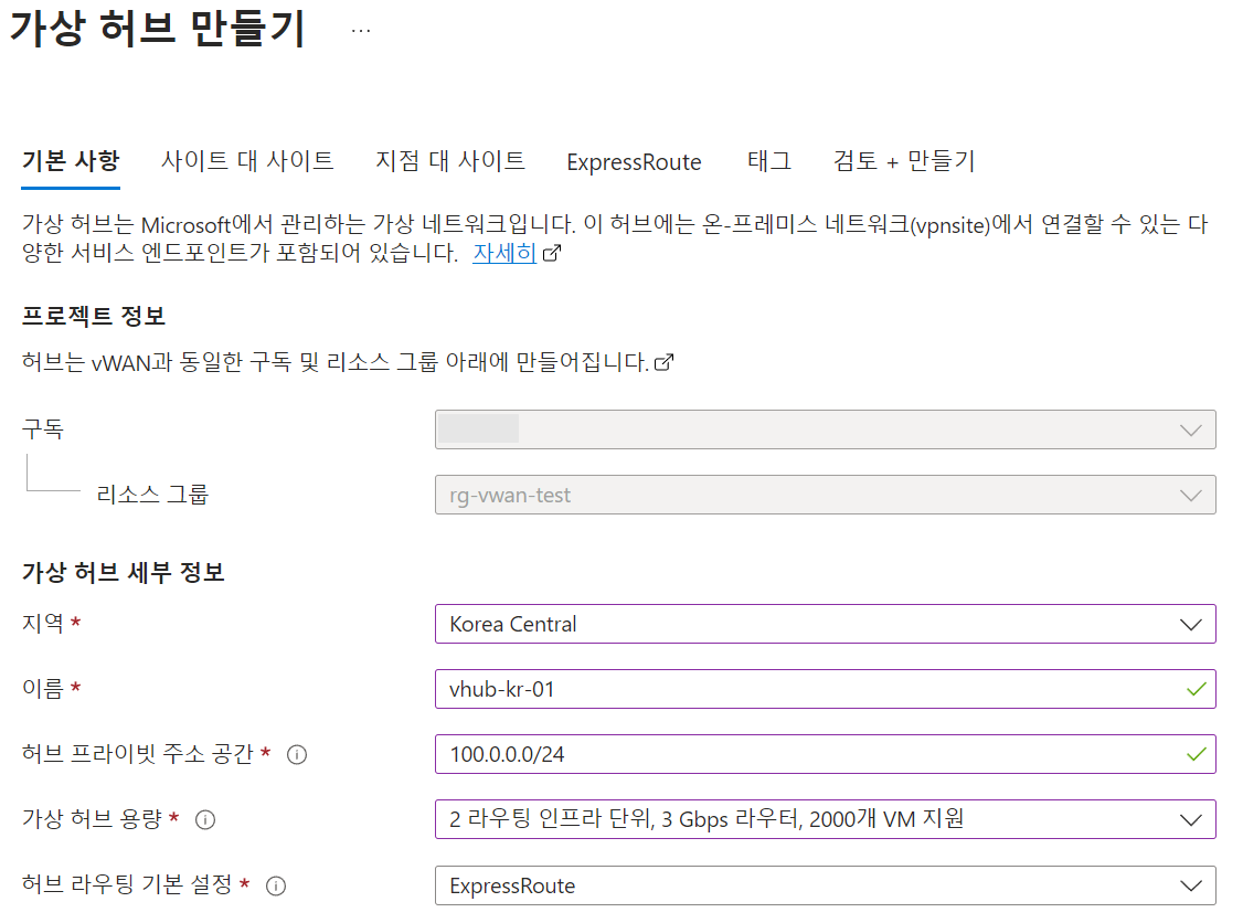 지역 : Korea Central # 가상 허브를 배포할 지역 선택