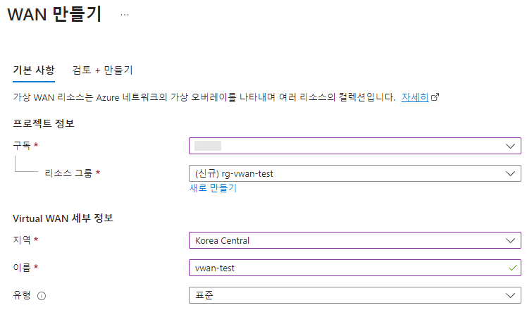 리소스 그룹 : rg-vwan-test #원하는 이름 입력