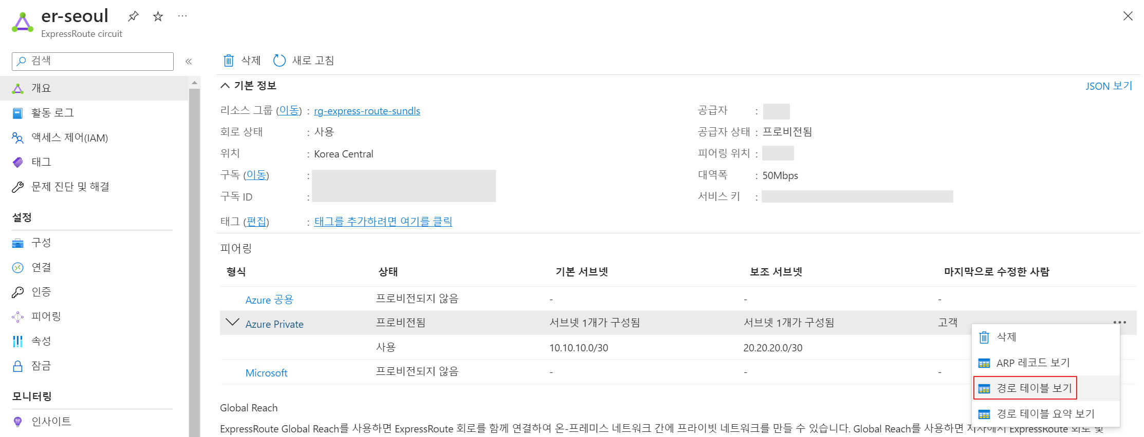 - [ExpressRoute Circuit]의 [개요] 탭에서 [Azure Private 피어링]의 우측 더 보기 버튼을 클릭한 후 [경로 테이블 보기]를 클릭합니다.