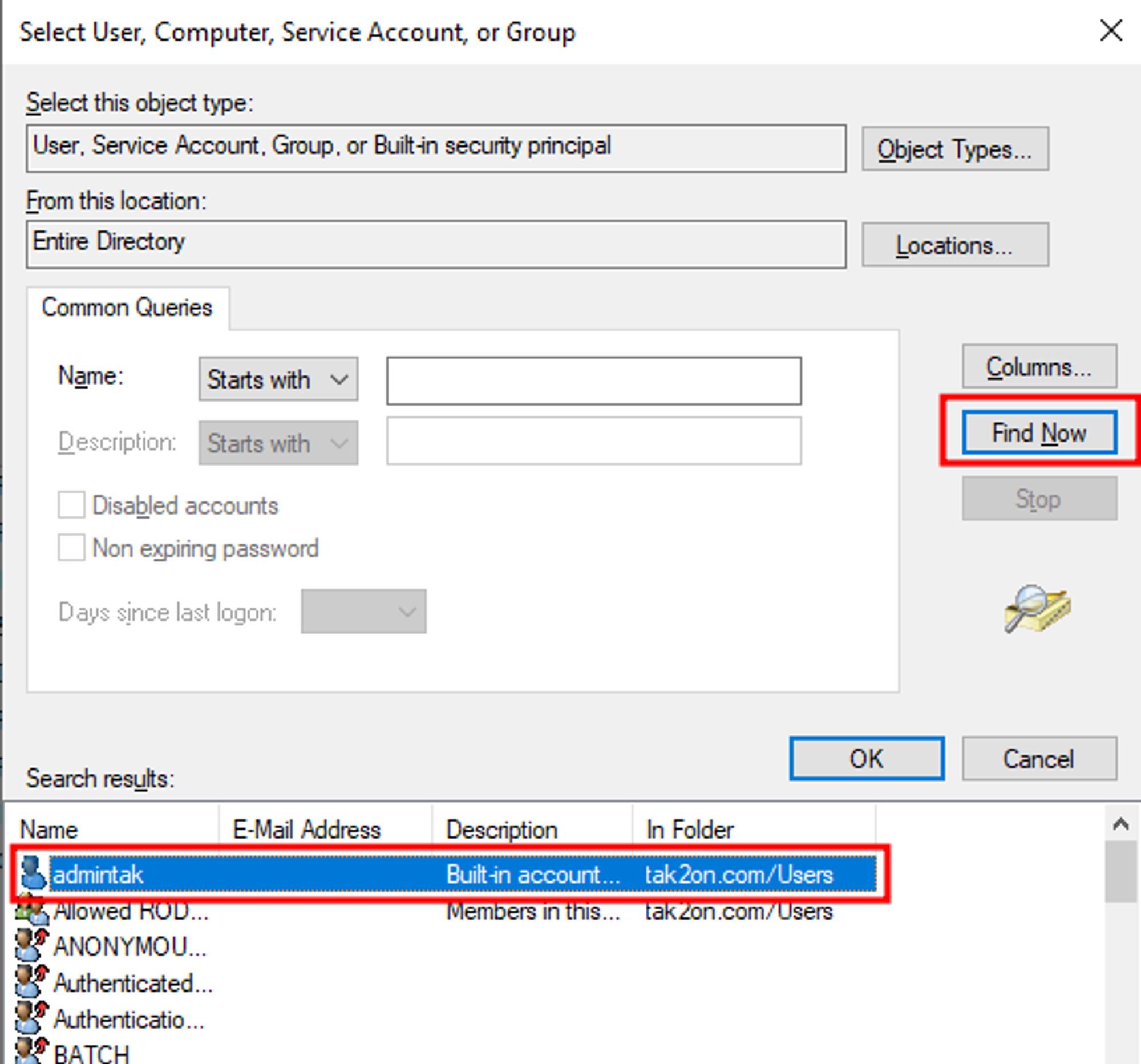 - <<Browe..>> 선택하여 [SQL Server Agent & SQL Server Database Engine]의 Account Name을 AD 서버의 도메인 관리자 값(tak2on\admintak)으로 설정 후, Password 입력