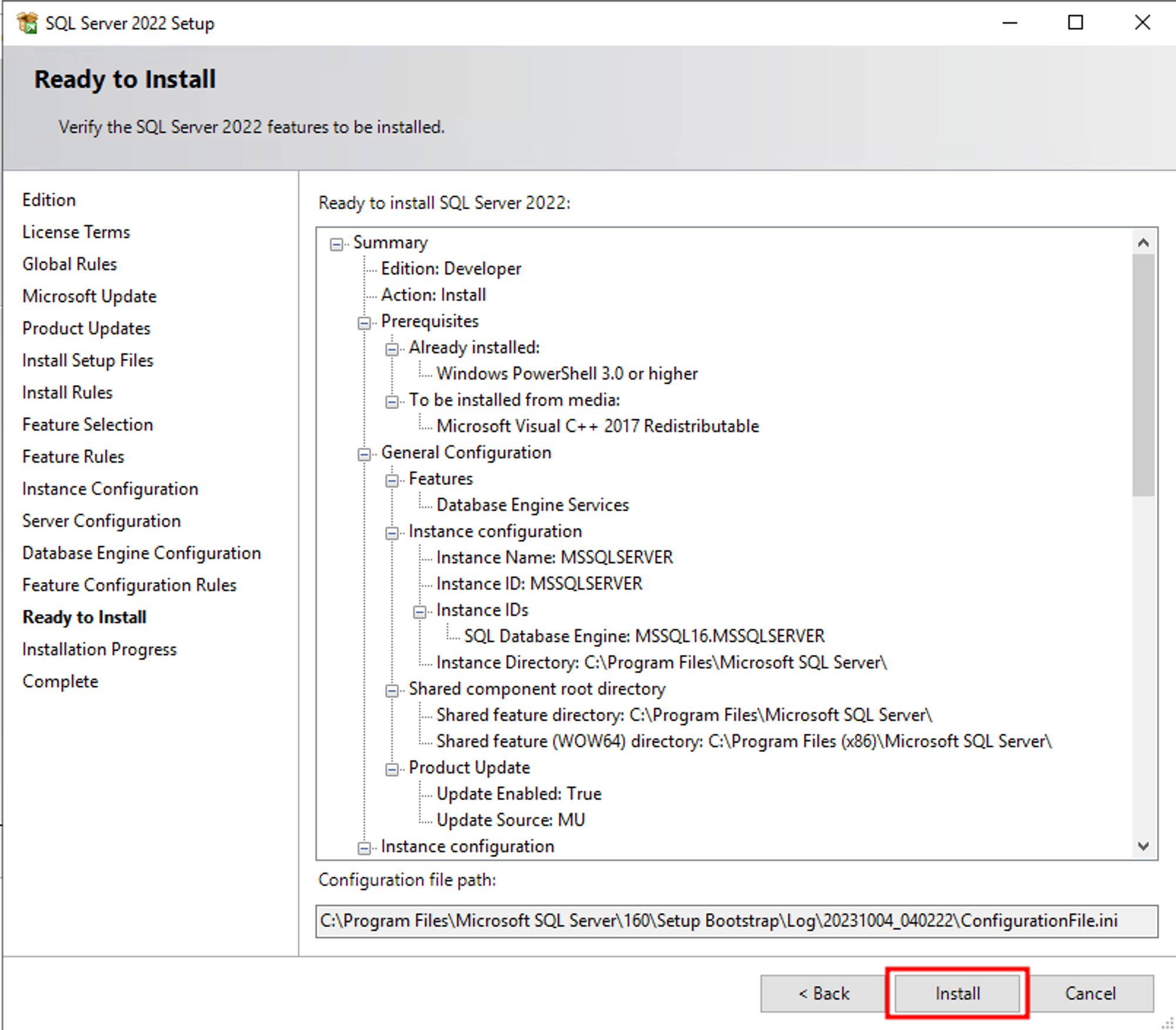 - 이후, 기타 옵션은 Default 값 설정 후, 지금까지 구성 사항을 트리형식으로 확인 후, [Install]