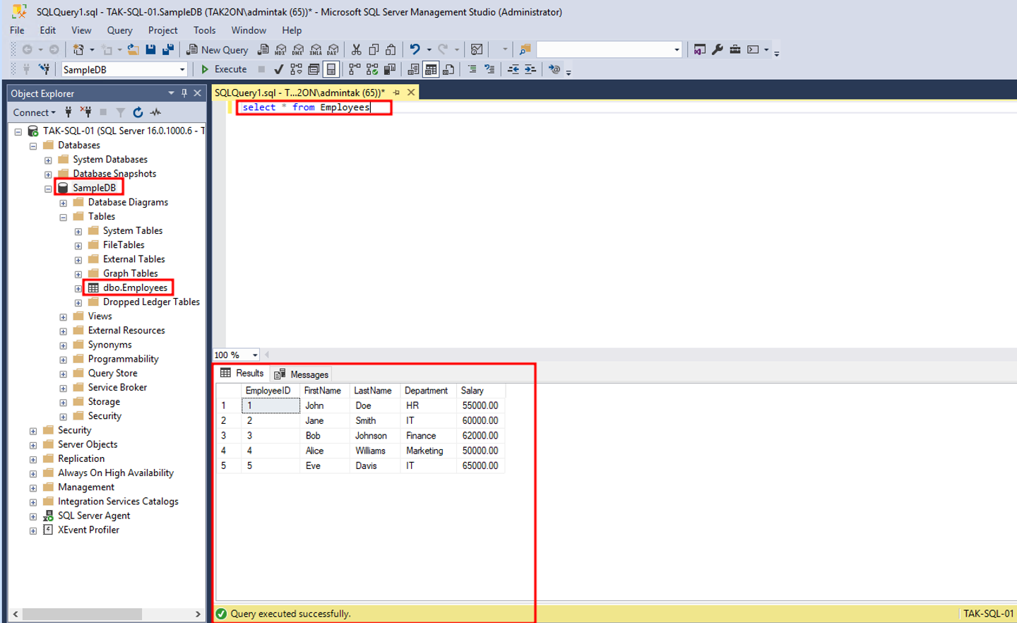 -- 샘플 데이터베이스 생성 CREATE DATABASE SampleDB; -- 생성된 데이터베이스로 이동 USE SampleDB; -- 샘플 Employees 테이블 생성 CREATE TABLE Employees ( EmployeeID INT PRIMARY KEY, FirstName NVARCHAR(50), LastName NVARCHAR(50), Department NVARCHAR(50), Salary DECIMAL(10, 2) ); -- 데이터 삽입 INSERT INTO Employees (EmployeeID, FirstName, LastName, Department, Salary) VALUES (1, 'John', 'Doe', 'HR', 55000.00); INSERT INTO Employees (EmployeeID, FirstName, LastName, Department, Salary) VALUES (2, 'Jane', 'Smith', 'IT', 60000.00); INSERT INTO Employees (EmployeeID, FirstName, LastName, Department, Salary) VALUES (3, 'Bob', 'Johnson', 'Finance', 62000.00); INSERT INTO Employees (EmployeeID, FirstName, LastName, Department, Salary) VALUES (4, 'Alice', 'Williams', 'Marketing', 50000.00); INSERT INTO Employees (EmployeeID, FirstName, LastName, Department, Salary) VALUES (5, 'Eve', 'Davis', 'IT', 65000.00); - Select 문 사용하여 데이터 조회