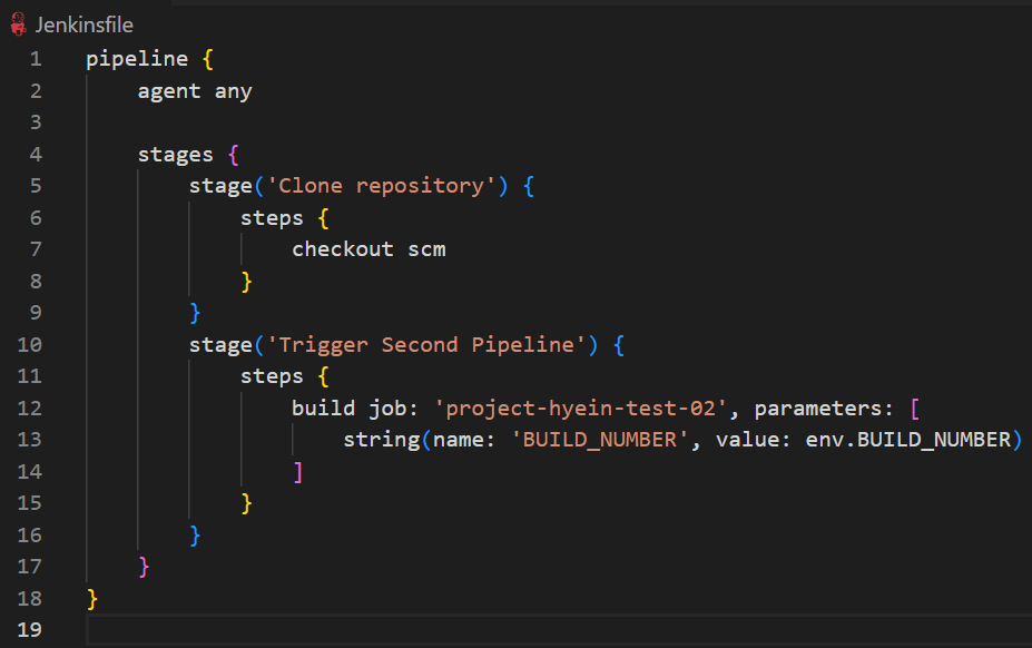 - 두 번째 Jenkins Pipeline의 Jenkinsfile은 하기와 같습니다.