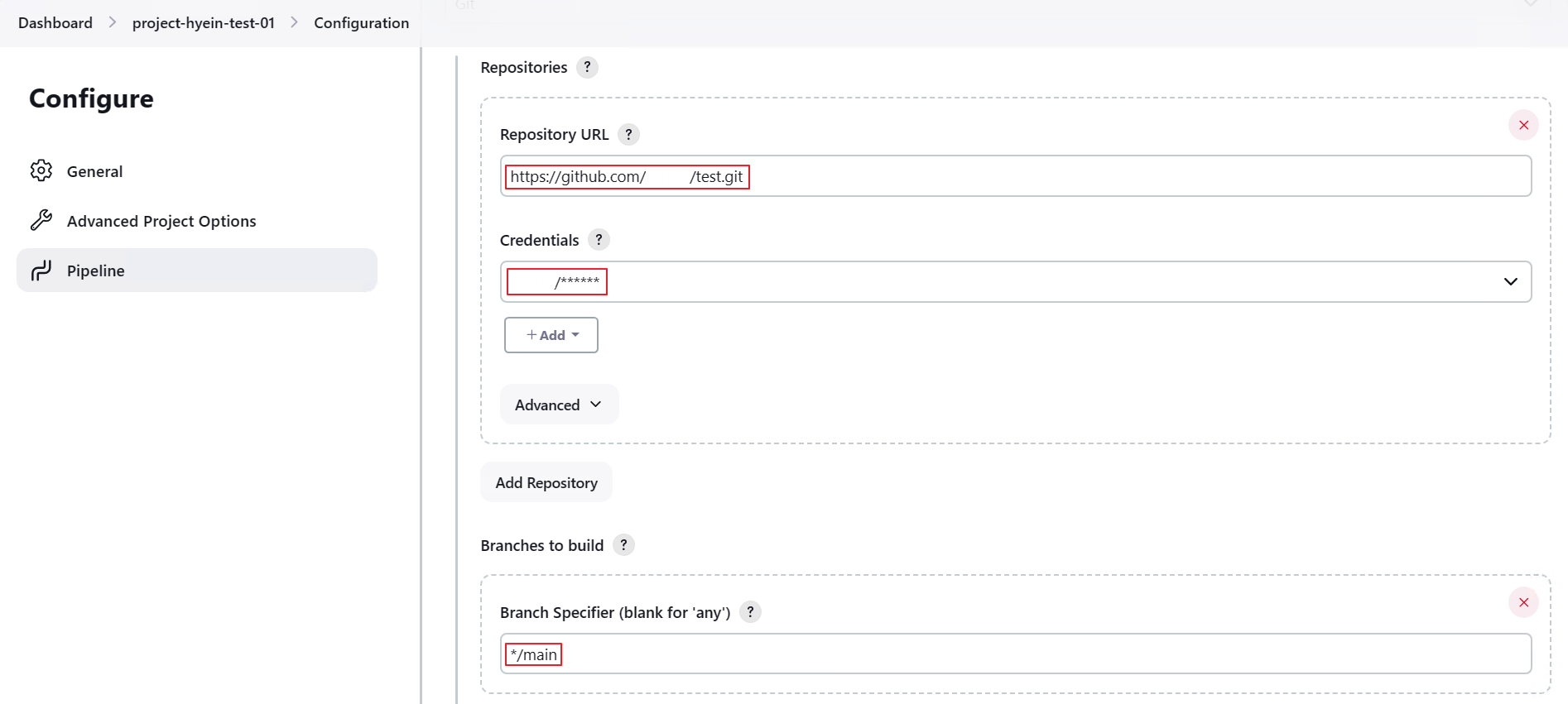 - 다시 Jenkins로 돌아와 복사한 Repository URL을 붙여 넣은 후 GitHub 계정 이름과 PAT를 사용하여 Credentials을 생성합니다.