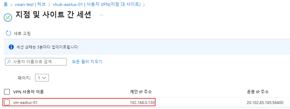 - [지점 및 사이트 간 세션]을 클릭하여 클라이언트 연결이 잘 되었는지 확인합니다.