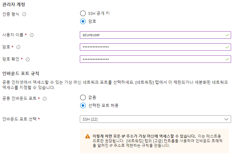 사용자 이름 : azureuser# 사용할 사용자 이름 입력
