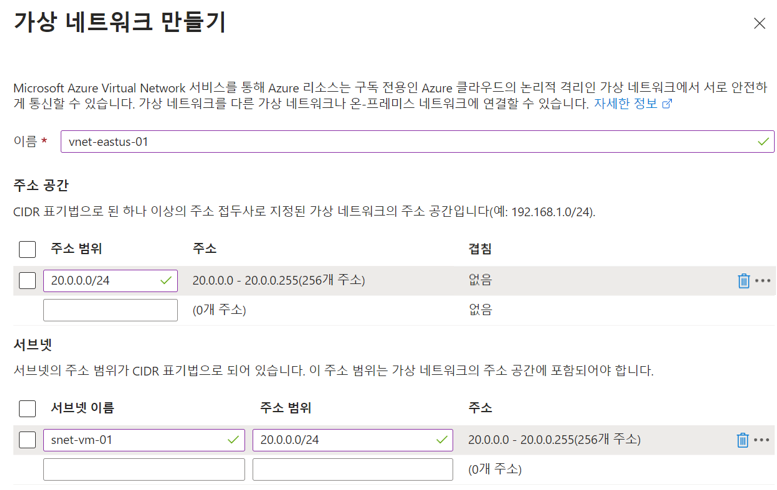 주소 범위 : 20.0.0.0/24# 가상 네트워크 주소 대역 입력
