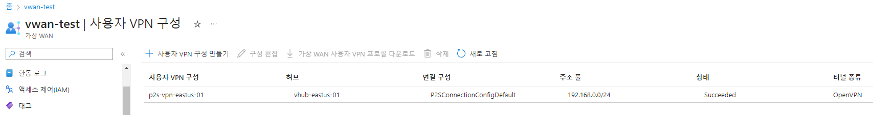 - 생성한 [Virtual WAN]의 [연결] 블레이드의 [사용자 VPN 구성] 탭에서 P2S VPN 연결 자체에 대한 세부 내역을 확인할 수 있습니다.