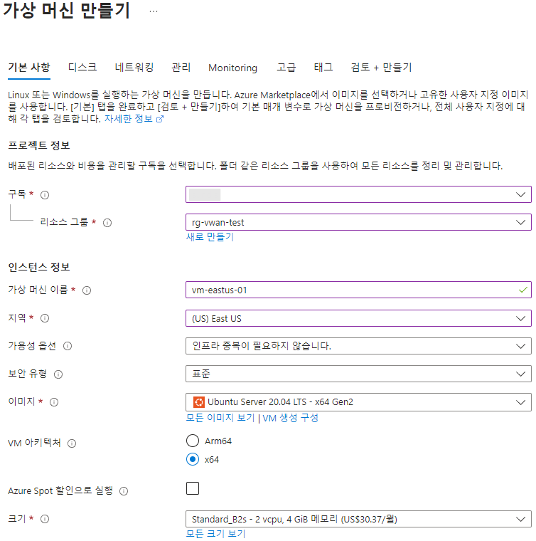 리소스 그룹 : rg-vwan-test# 가상 머신이 위치할 리소스 그룹 선택