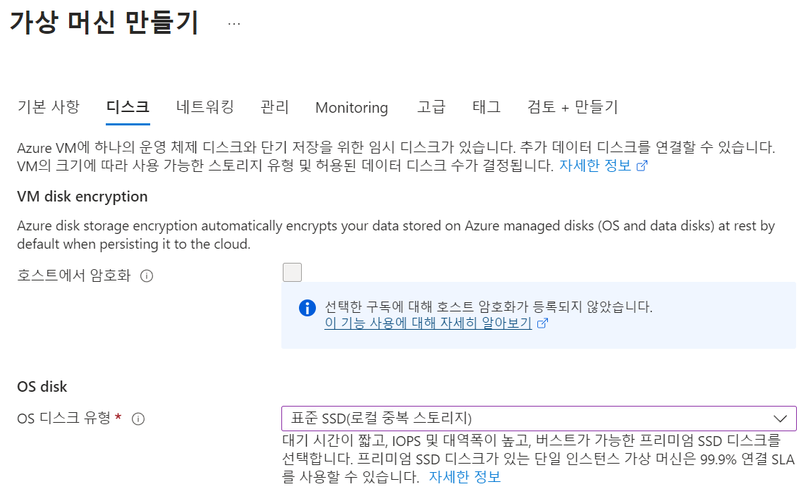 OS 디스크 유형 : 표준 SSD(로컬 중복 스토리지)