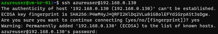 - ssh azureuser@<VPN 주소 풀 대역에서 할당 받은 사설 ip> 입력